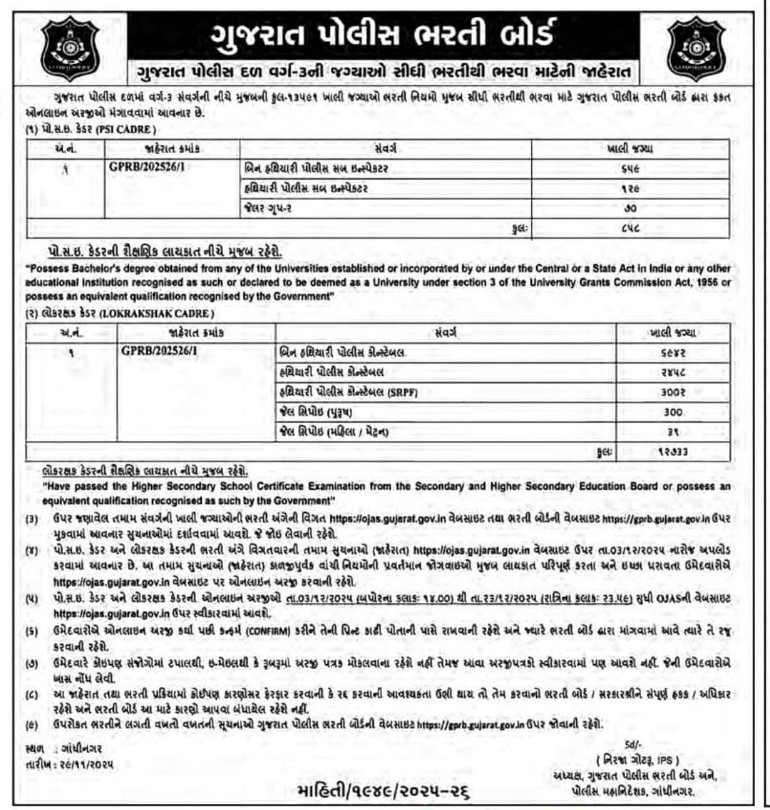 The Gujarat Police Department has officially announced a massive state-wide recruitment drive, offering a total of 13,591 vacancies across multiple categories including Sub Inspector, Police Constable, SRPF, Jail Sipai, and other posts. This recruitment is one of the largest police vacancy announcements in recent years, providing a major opportunity for thousands of aspiring candidates across … Read more