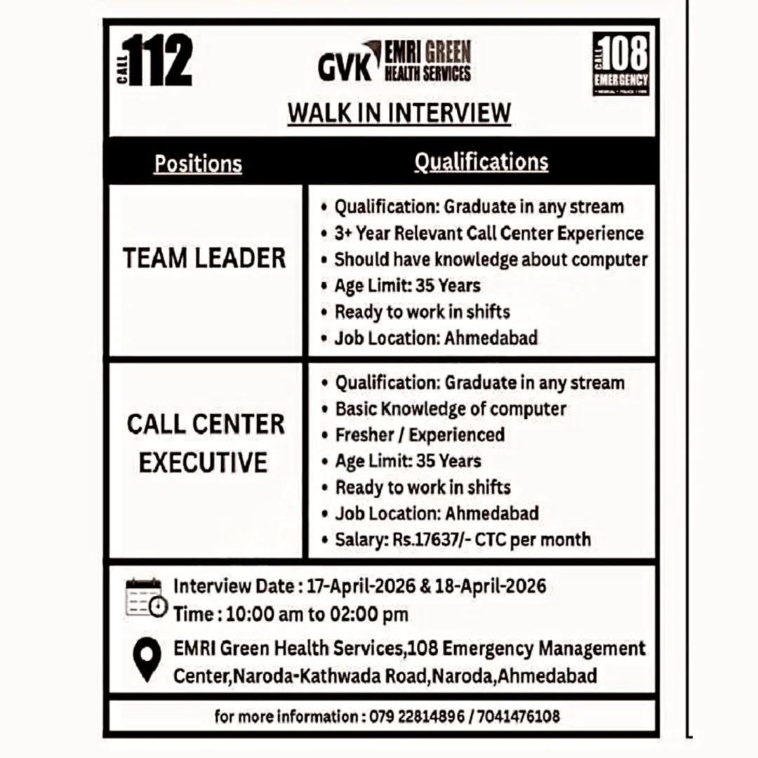 The EMRI Green Health Services operating the 108 emergency ambulance service in Gujarat has announced Gujarat 108 Recruitment 2026 for the post of Call Center Executive. Graduate candidates with basic computer knowledge can attend the walk-in interview on 18 March 2026 in Ahmedabad. This recruitment offers a good opportunity for freshers and experienced candidates who want to work with the state’s emergency response system managed by GVK EMRI.